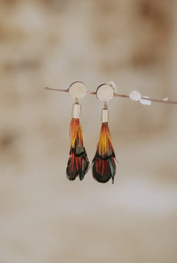 "Exotique" sont des boucles d'oreilles coloré alliant des plumes verte aux jolis reflets et des plumes aux tons chaud jaune et rouge. L'alliance parfaite pour l'été!