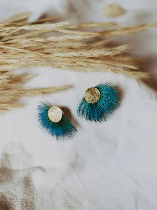 "Lagon" sont des boucles d'oreilles coloré en plumes de paon bleu et aux reflets métallisé.