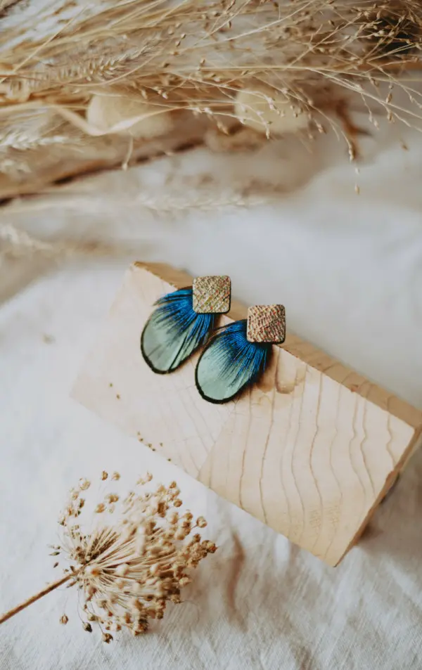 Du vert profond de la plume de faisan, du bleu métallique de la plume de paon sublimé par une puce en cuir holographique.