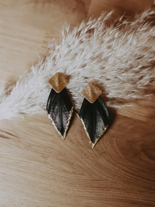 Elles allient les plumes noirs irisé du coq à la forme graphique et la précieuse feuille d'or.