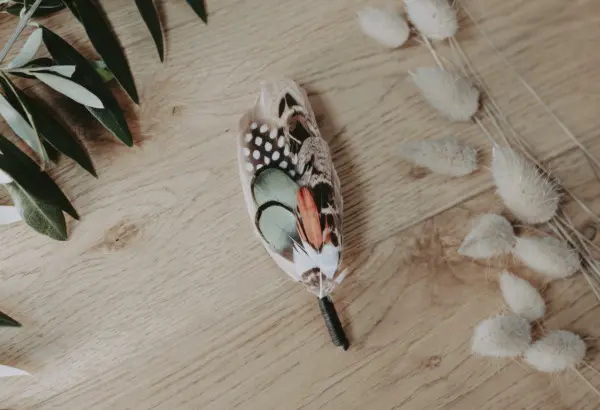 "Théo" est une boutonnières en plumes véritables d'oie, de pintade et de faisan.