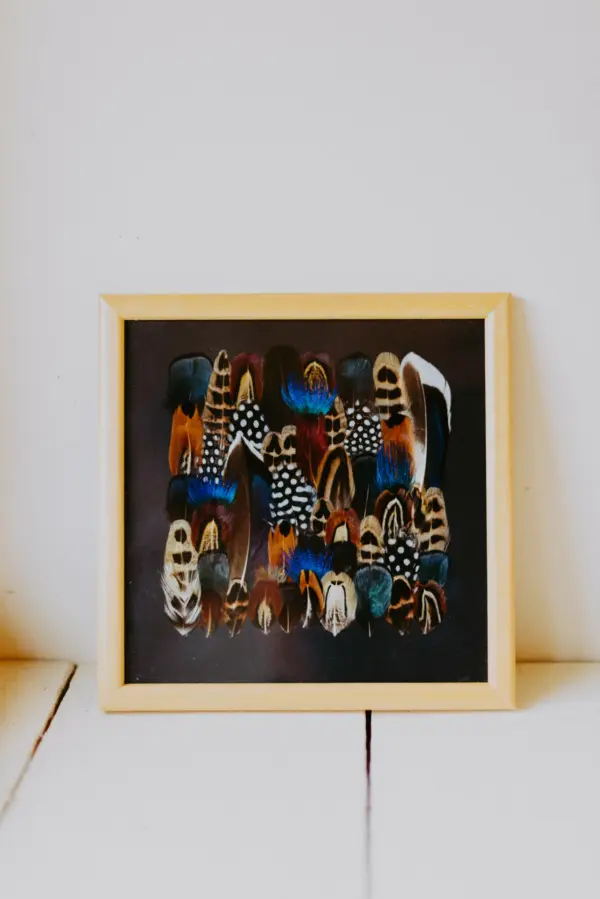 Composition en plumes sur feuille cartonnée noir, montée dans un joli cadre en bois à fixer au mur.