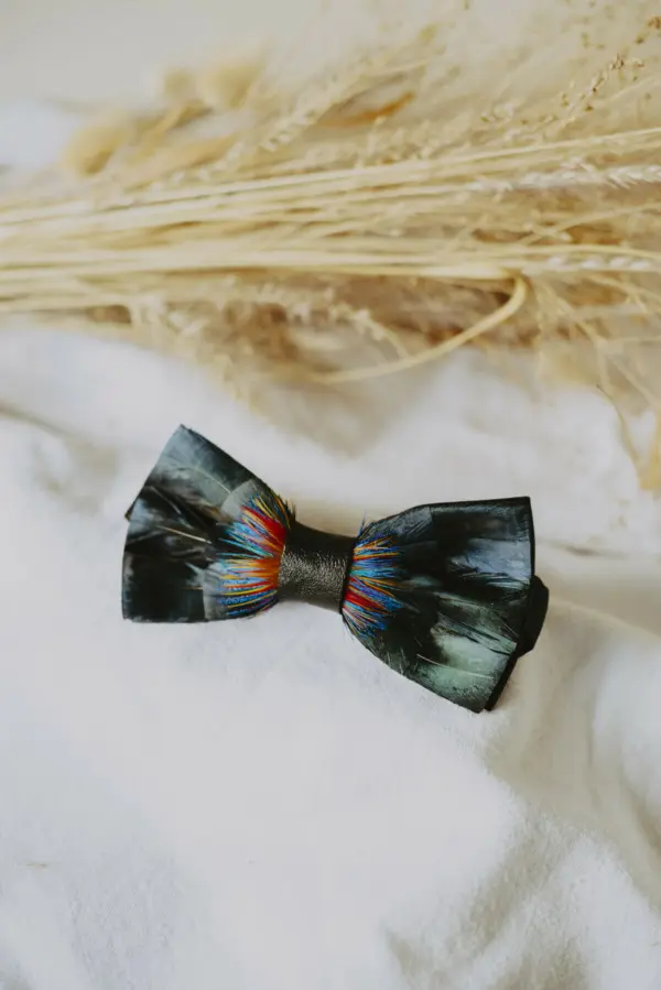Apportez une touche d'élégance et de sophistication à vos tenues grâce au noeud papillon "Azur", un accessoire unique en plumes, satin et cuir de qualité. Idéal pour les mariages, les soirées chics ou les occasions décontractées, ce noeud papillon bohème vous permettra de vous démarquer avec style.