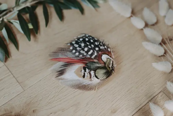 "Lagon" est un bibi en plumes de pintade, d'oie et de faisan.